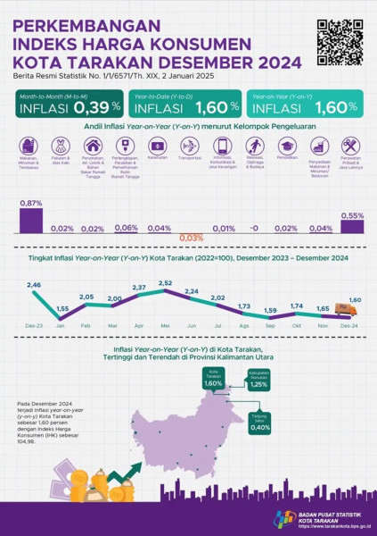Perkembangan Indeks Harga Konsumen Kota Tarakan Desember 2024Pada Desember 2024 terjadi inflasi year on year (y-on-y) Kota Tarakan sebesar 1,60 persen...