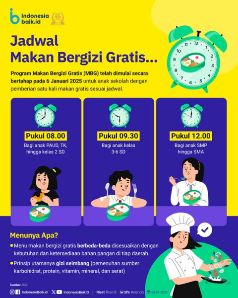 Jadwal Makan Bergizi GratisProgram Makan Bergizi Gratis (MBG) telah dimulai secara bertahap pada 6 Januari 2025 untuk anak sekolah dengan pemberian sa...