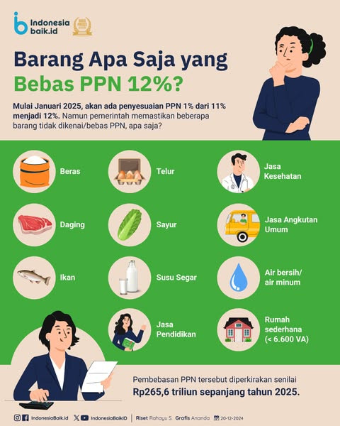 Barang Apa Saja yang Bebas PPN 12%?Mulai Januari 2025, pemerintah akan memberlakukan penyesuaian Pajak Pertambahan Nilai (PPN) dari 11% menjadi 12%. N...