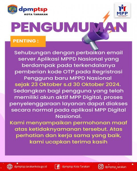 PENGUMUMAN:Sehubungan dengan perbaikan email server aplikasi MPP Digital Nasional yang berdampak pada terkendalanya pemberian kode OTP pada registrasi...