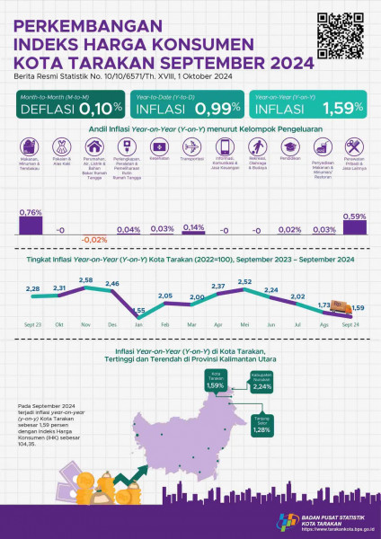 Perkembangan Indeks Harga Konsumen Kota Tarakan September 2024Pada September 2024 terjadi inflasi year on year (y-on-y) Kota Tarakan sebesar 1,59 pers...