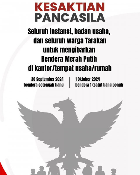 Seluruh Instansi, Badan Usaha dan Seluruh Warga Tarakan Untuk Mengibarkan Bendera Merah Putih di Kantor / Tempat Usaha / Rumah30 September 2024 : Bend...