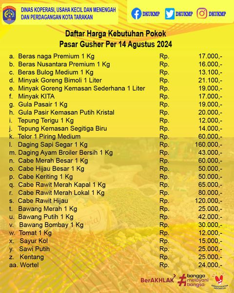 Daftar Harga Kebutuhan Pokok 14 Agustus 2024 di Kota TarakanUpdate Daftar Harga Kebutuhan Pokok di Kota TarakanTanggal 14 Agustus 2024#DKUKMP #Bapok #...