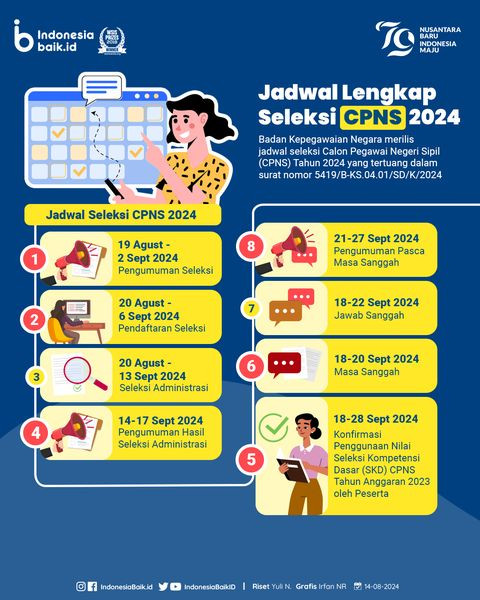 Jadwal Lengkap Seleksi CPNS 2024Badan Kepegawaian Negara (BKN) resmi menyampaikan jadwal seleksi pengadaan CPNS 2024 mulai dari pengumuman, pend...