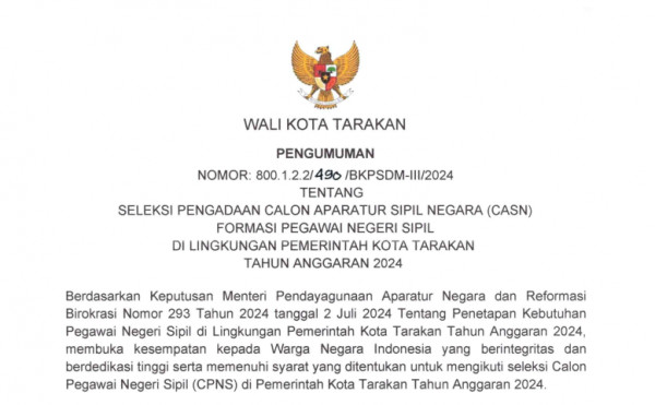 Penerimaan CPNS 2024 Pemerintah Kota TarakanSeleksi Pengadaan Calon Aparatur Sipil Negara (CASN) Formasi Pegawai Negeri Sipil Di Lingkungan Pemerintah...