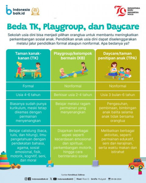 Beda TK, Playgroup, dan DaycareMenghadapi masa tumbuh kembang anak, sebagai orang tua seringkali dihadapkan pada pilihan antara TK, Playgroup, dan Day...