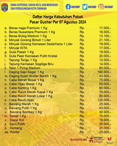 Daftar Harga Kebutuhan Pokok 7 Agustus 2024 di Kota TarakanUpdate Daftar Harga Kebutuhan Pokok di Kota TarakanTanggal 07 Agustus 2024#DKUKMP #Bapok #K...