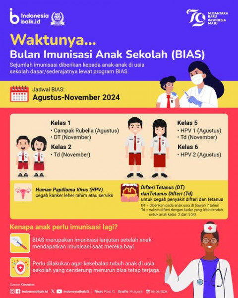 Waktunya.. Bulan Imunisasi Anak Sekolah (BIAS)Bulan Imunisasi Anak Sekolah (BIAS) telah tiba!Ayo cek jadwal imunisasi dari sekolah atau Fasilitas Pela...
