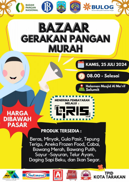 Bazaar Gerakan Pangan Murah 25 Juli 2024Kamis, 25 Juli 202408/00 - selesaiHalaman Masjid Al Ma'arif Selumit, TarakanHarga Dibawar PasarProduk Tersedia...