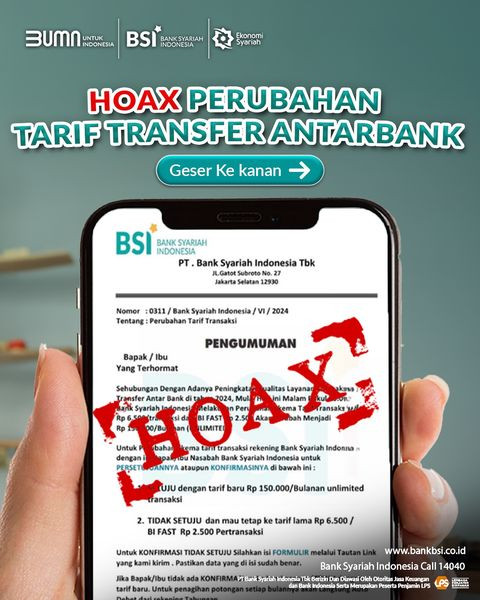 Hoax Perubahan Tarif Transfer AntarbankAssalamu’alaikum Sahabat Syariah!Jangan mudah percaya! Beredar informasi palsu te...