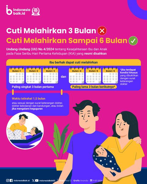 Kini, Ibu Bisa Cuti Melahirkan Sampai 6 BulanPresiden Joko Widodo (Jokowi) resmi meneken UU Nomor 4 Tahun 2024 tentang Kesejahteraan Ibu dan Anak (KIA...