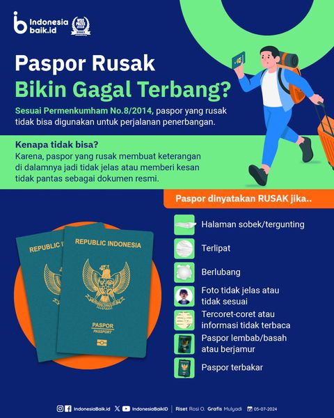 Paspor Rusak Bikin Gagal Terbang?Sesuai Permenkumham No.8/2014, paspor yang rusak tidak bisa digunakan untuk perjalanan penerbangan.Ramai soal kasus s...