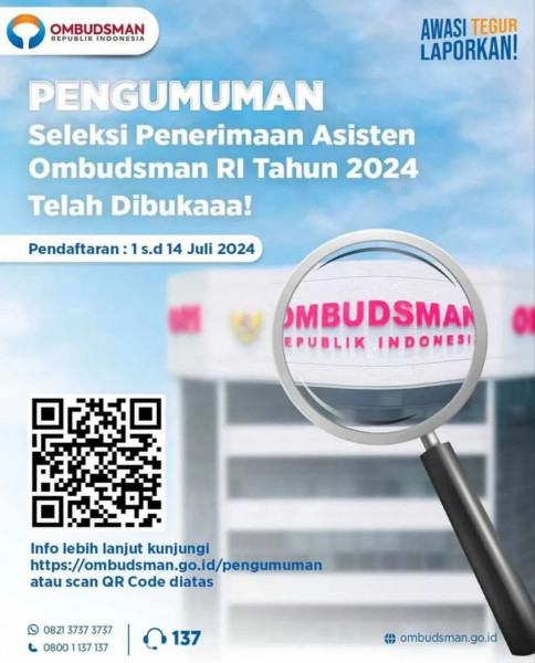 Seleksi Penerimaan Asisten Ombudsman RI Tahun 2024 Telah DibukaOmbudsman RI membuka seleksi asisten Ombudsman tahun 2024.Silakan cek pengumuman : ombu...