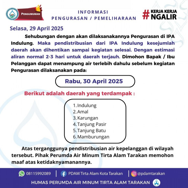 Sehubungan dengan akan dilaksanakannya Pengurasan di IPA Indulung. Maka pendistribusian dari IPA Indulung kesejumlah daerah akan dihentikan sampai keg...