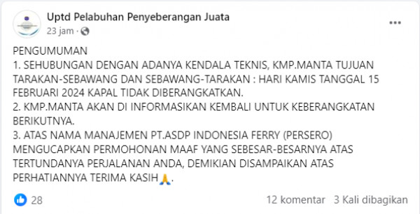 PENGUMUMAN1. SEHUBUNGAN DENGAN ADANYA KENDALA TEKNIS, KMP.MANTA TUJUAN TARAKAN-SEBAWANG DAN SEBAWANG-TARAKAN : HARI KAMIS TANGGAL 15 FEBRUARI 2024 KAP...