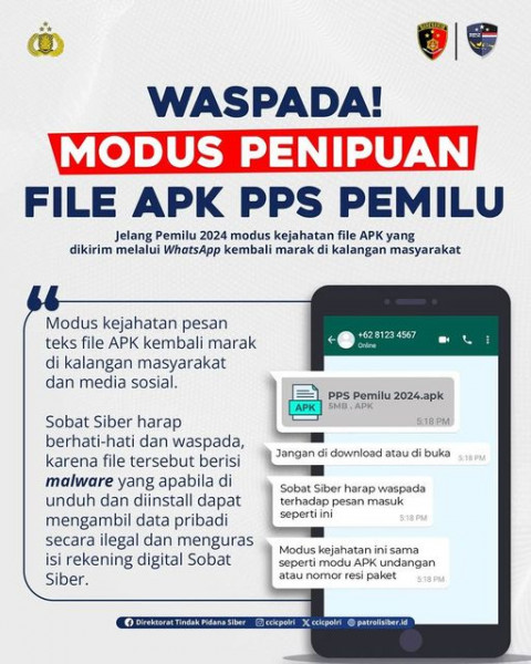 Wasapada Modus Penipuan File APK PPS Pemilu !Modus kejahatan pesan teks file APK kembali marak di kalangan masyarakat dan media sosial.Sobat Siber har...