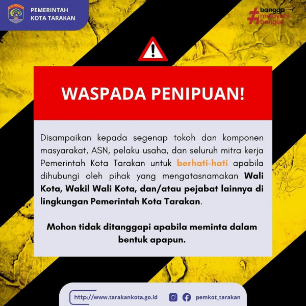 Waspada Penipuan!Mohon tidak ditanggapi bila terdapat pihak yang mengatasnamakan Wali Kota, Wakil Wali Kota, dan/atau pejabat di Lingkungan Pemkot Tar...