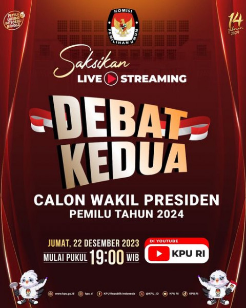 #repostedfrom @kpu_ri #TemanPemilih, saksikan Live Streaming Debat Kedua Calon Wakil Presiden Pemilu Tahun 2024, Hari Jumat, 22 Desember 2023 mulai pu...