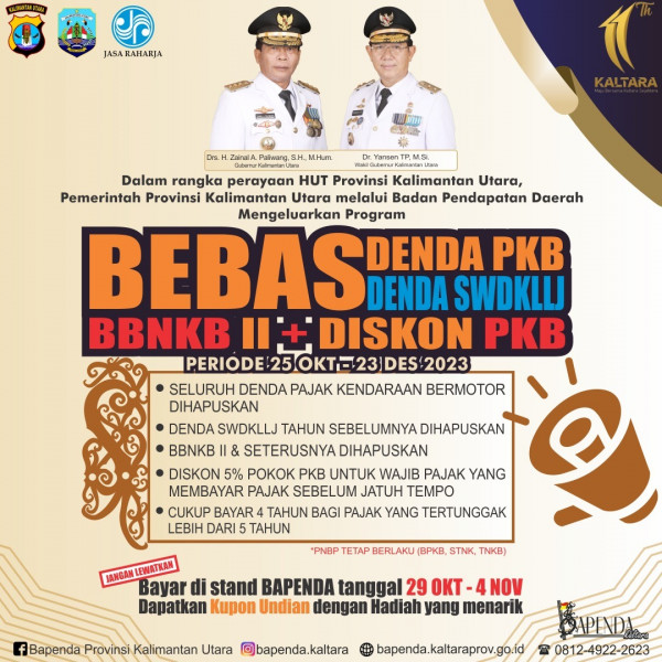 Kabar Gembira untuk Sobat Bapenda Kaltara Semua.Hadir Kembali Bebas Denda Pajak Kendaraan dan Diskon 5% Pokok PKB Untuk Wajib Pajak Yang Membayar Paja...