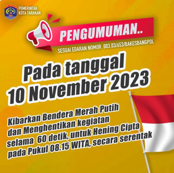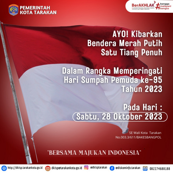Himbauan Pengibaran Bendera Merah Putih Satu tiang Penuh sesuai Surat Edaran Wali Kota Tarakan Nomor 003.3/611/Bakesbangpol tanggal 16 Oktober 2023 te...