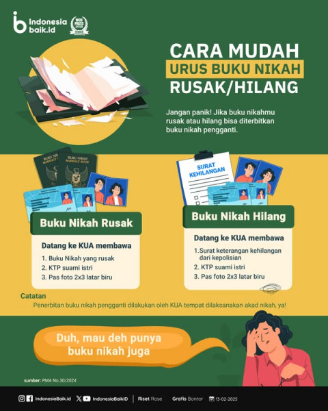 Jika SohIB mengalami kehilangan atau kerusakan buku nikah, tak perlu khawatir ya! Kamu bisa mengajukan penggantian buku nikah tanpa biaya apa pun.Untu...