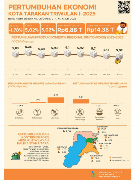 Ekonomi Kota Tarakan Triwulan I-2025 Tumbuh 5,02 Persen (y-on-y) Ekonomi Kota Tarakan Triwulan I-2025 Terkontraksi 1,78 Persen (q-to-q)Sumber : B...