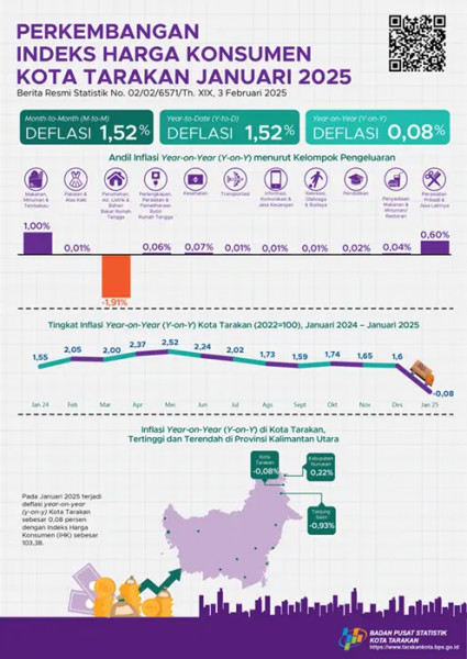 Perkembangan Indeks Harga Konsumen Kota Tarakan Januari 2025Pada Januari terjadi deflasi year on year (y-on-y) Kota Tarakan sebesar 0,08 persen dengan...