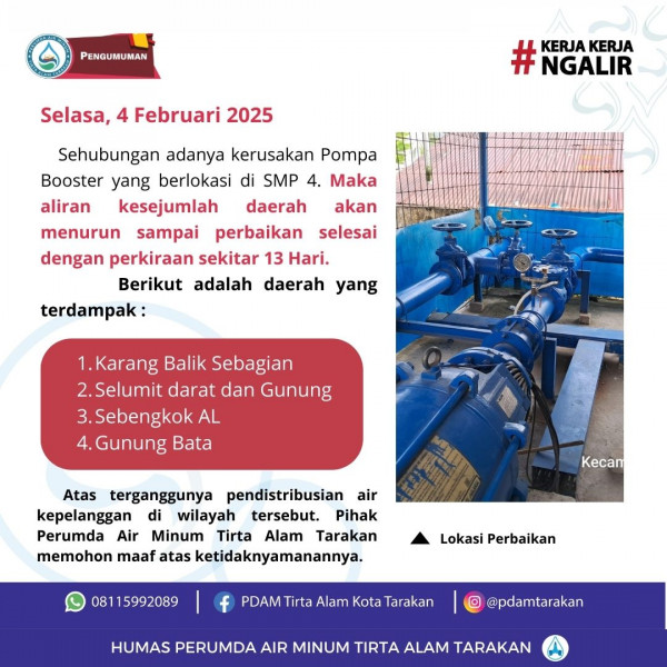 Perbaikan Pompa Booster PDAM Berdampak Terganggunya Pendistribusian AirSehubungan adanya kerusakan Pompa Booster yang berlokasi di SMP 4. Maka al...