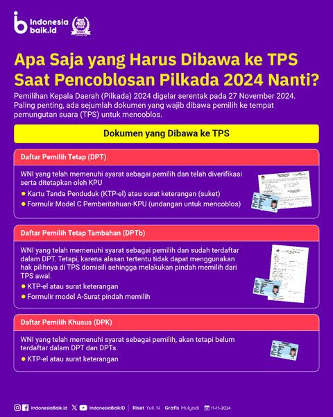 Apa Saja yang Harus Dibawa ke TPS Saat Pencoblosan Pilkada 2024 Nanti?Pemilihan Kepala Daerah (Pilkada) 2024 digelar serentak pada 27 November 2024.&n...