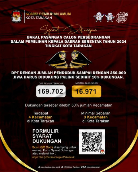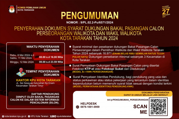 Hallo #TemanPemilih Berikut ini Persyaratan Penyerahan dokumen syarat dukungan Bakal Pasangan Calon Perseorangan Walikota dan Wakil Walikota Kota Tara...