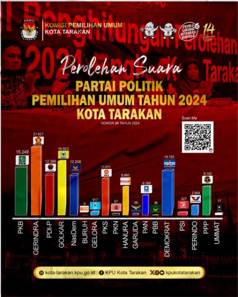 #TemanPemilih, berikut Infografis Perolehan Suara Partai Politik Peserta Pemilu Tahun 2024 di Kota Tarakan.Yuk like, comment dan share, #TemanPemilih...