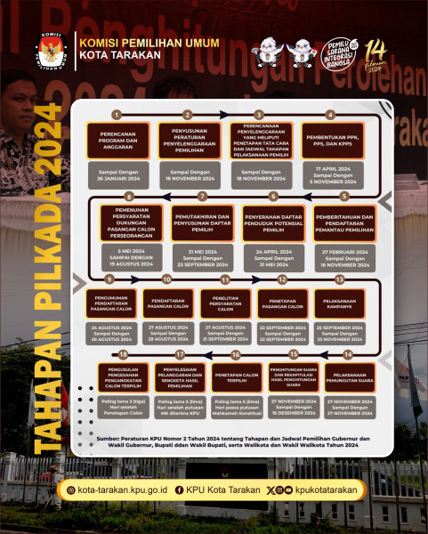 #TemanPemilih, berikut tahapan dan jadwal Pilkada 2024, berdasarkan Peraturan KPU Nomor 2 Tahun 2024. #kpumelayani #kputarakanSumber FB : KPU Kota Tar...