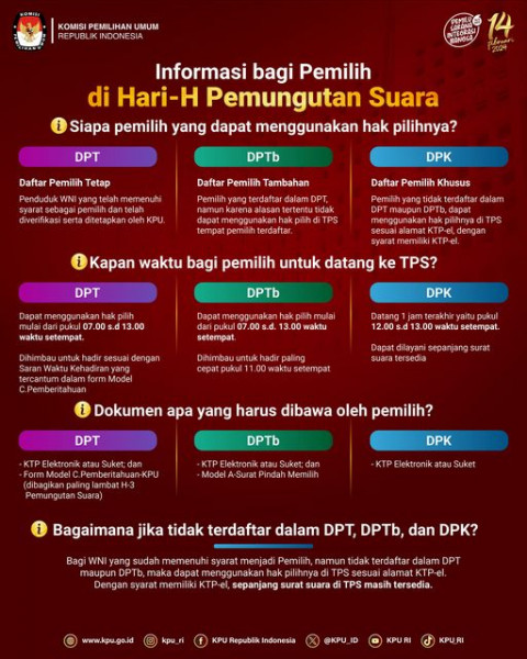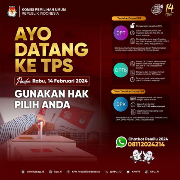 #TemanPemilih, Ayo Datang ke Tempat Pemungutan Suara pada hari Rabu, 14 Februari 2024. Gunakan Hak Pilih Anda. Untuk pemilih yang terdaftar sebag...