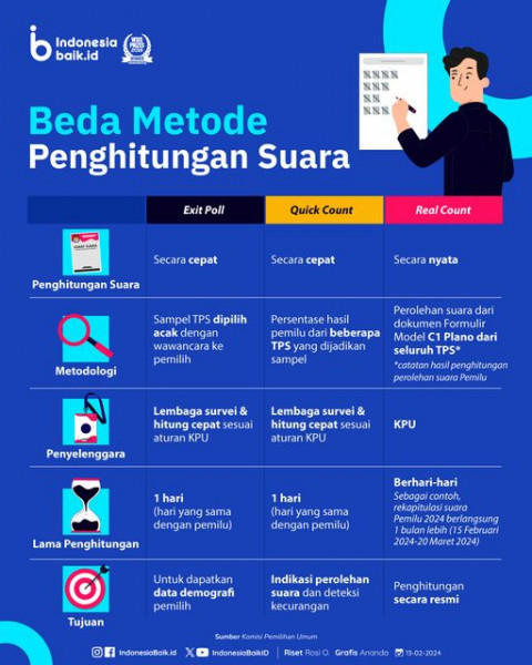 Beda Quick Qount, Exit Poll, dan Real CountTerdapat beberapa istilah yang berkaitan dengan proses penghitungan suara dalam Pemilu. Diantaranya Exit Po...