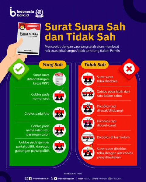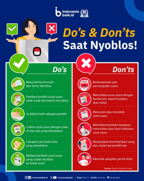 Do's & Don'ts Saat Nyoblos!Pemilih diharuskan terlebih dulu mengecek kondisi surat suara. Hal ini dimaksud untuk mengecek apakah surat suara dalam...