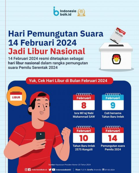 Hari Pemungutan Suara 14 Februari 2024 Jadi Libur NasionalPresiden Joko Widodo resmi menetapkan 14 Februari 2024 sebagai hari libur nasional dalam ran...