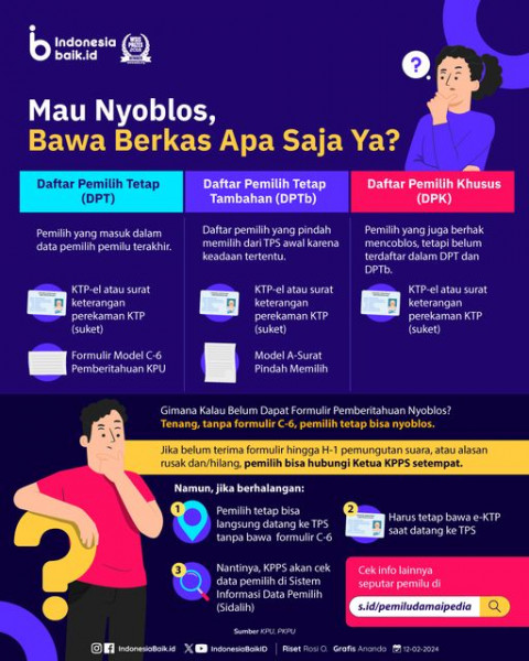 Mau Nyoblos, Bawa Berkas Apa Saja Ya?Meskipun tiap orang berhak memilih dalam pemilu 2024, namun ada perbedaan berkas yang dibawa ketika menyoblos dar...