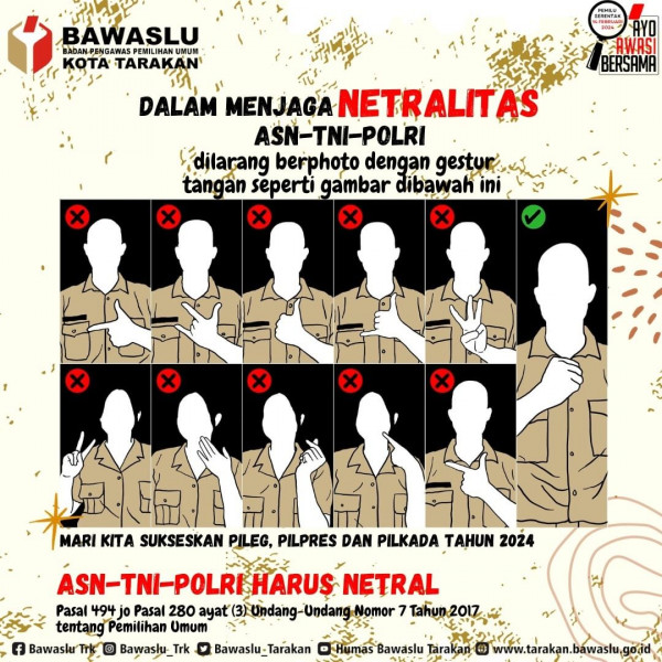 Dalam Menjaga Netralitas ASN#sahabatbawaslu ASN-TNI-POLRI Harus Netral. dilarang berphoto menggunakan gestur tangan sebagai berikut.@bawasluri @bawasl...
