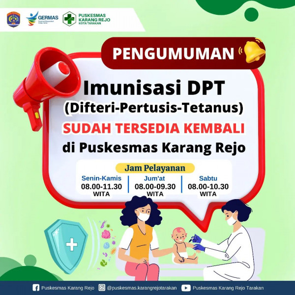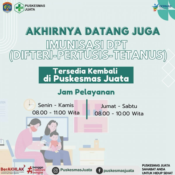 Imunisasi DPT Sudah Tersedia di Puskesmas JuataTelah tersedia kembali Imunisasi DPT (Difteri- Pertusis-Tetanus) di Puskesmas JuataJadwal PelayananSeni...