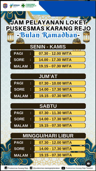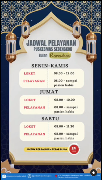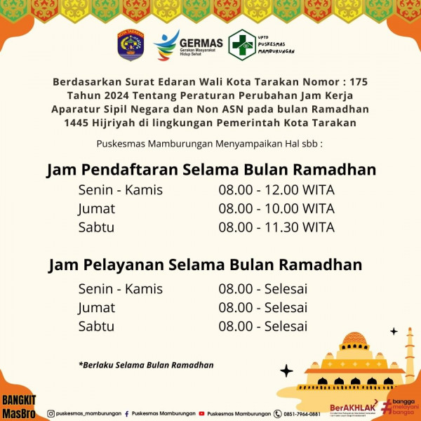 Jadwal Pelayanan Puskesmas Mamburungan Bulan RamadhanBerdasarkan Surat Edaran Wali Kota Tarakan Nomor : 175 Tahun 2024 Tentang Peraturan Perubahan Jam...