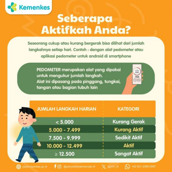 Seberapa Aktif Sobat Sehat Hari Ini?Cek yuk, kamu masuk kategori yang mana dari jumlah langkah harianmu.#CERDIK #CegahPTM #DukungGERMAS #P2P #Aktivita...