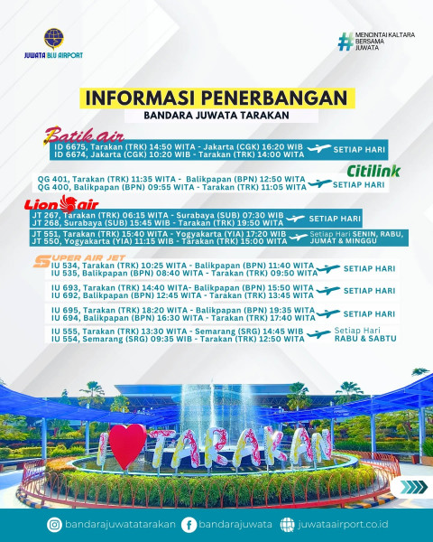 INFORMASI PENERBANGAN RESMIBandara Juwata Tarakan terus mendukung konektivitas wilayah Kalimantan Utara melalui layanan penerbangan reguler dan perint...