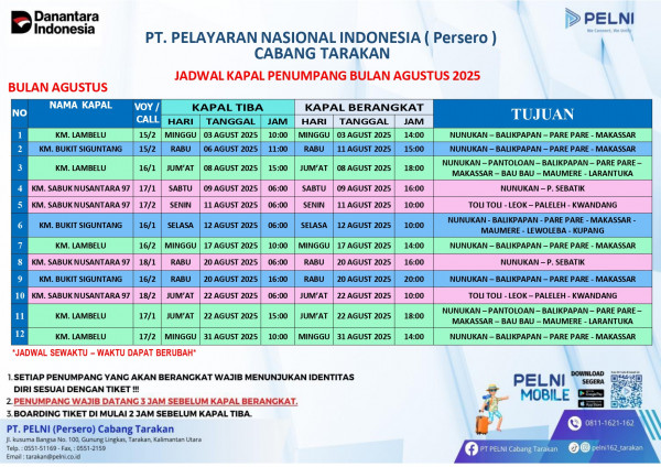 Jadwal Kapal PELNI Bulan Agustus 2025UPDATE : JADWAL KAPAL PENUMPANG YANG MENYINGGAHI PELABUHAN MALUNDUNG TARAKAN BULAN Agustus 2025.NB : BELILAH TIKE...