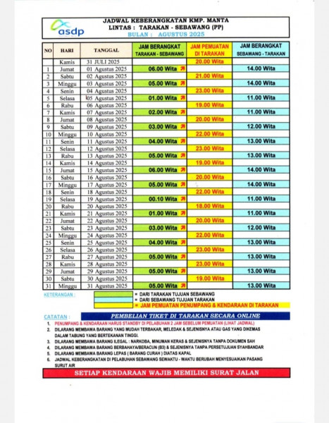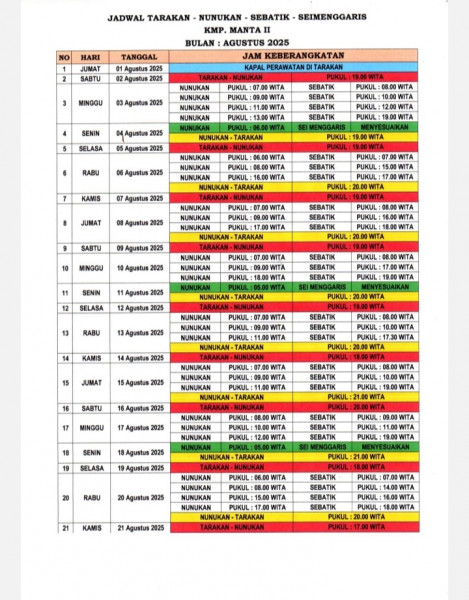 Jadwal Keberangkatan Kapal KMP Manta II Bulan Agustus 2025Lintas Tarakan - Nunukan - Sebatik Sei MenggarisSumber FB : Uptd Pelabuhan Penyeberangan Jua...