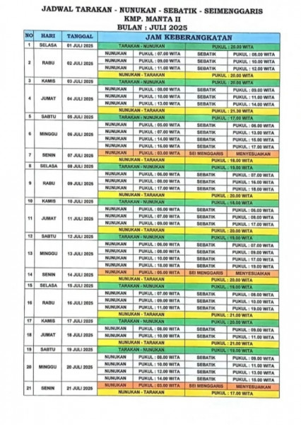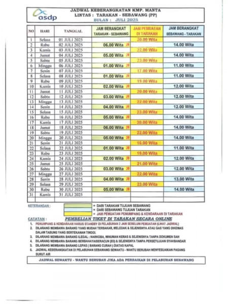 Jadwal Keberangkatan Kapal KMP Manta II Bulan Juli 2025Lintas Tarakan - Nunukan - Sebatik Sei MenggarisSumber FB : Uptd Pelabuhan Penyeberangan...