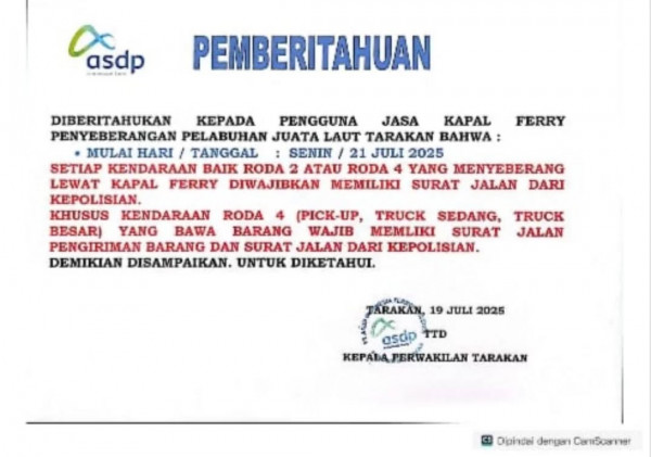 PemberitahuanDiberitahukan kepada pengguna jasa Kapal Ferry Penyeberangan Pelabuhan Juata Laut Tarakan Bahwa :Mulai Hari/Tanggal : Senin / 21 Juli 202...