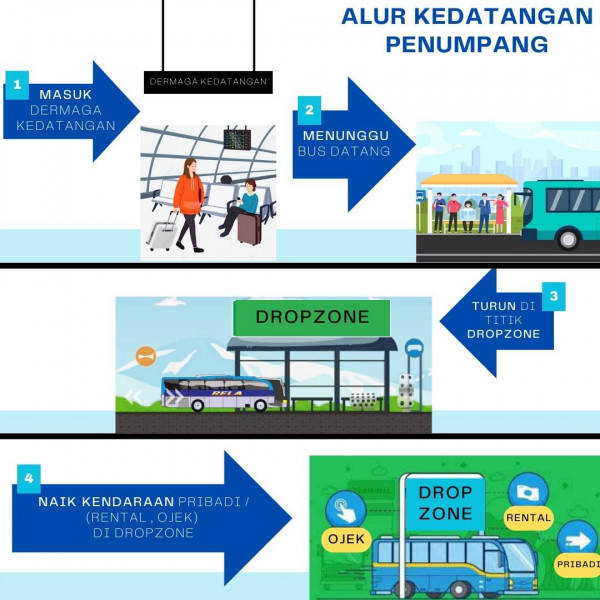 Berikut Alur kedatangan penumpang :1. Penumpang memasuki dermaga kedatangan2. Menunggu penjemputan bus3. Bus menuju arah dropzone untuk tempat pemberh...