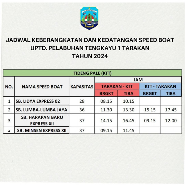 Jadwal keberangkatan dan kedatangan Speedboat UPTD Pelabuhan Tengkayu I Tarakan Tahun 2024Tarakan-Tideng Pale (KTT)Sumber Instagram : pelabuhan_sdf.ta...