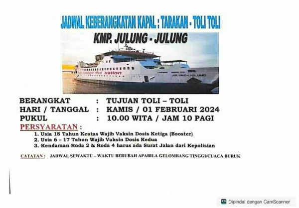 Jadwal Keberangkatan Kapal KMP Julung-Julung Tarakan - Toli-Toli 1 Februari 2024