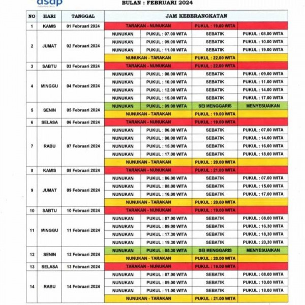 Jadwal Keberangkatan dan Tarif Kapal Lintas Tarakan - Nunukan - Sebatik Sei Menggaris Bulan Februari 2024